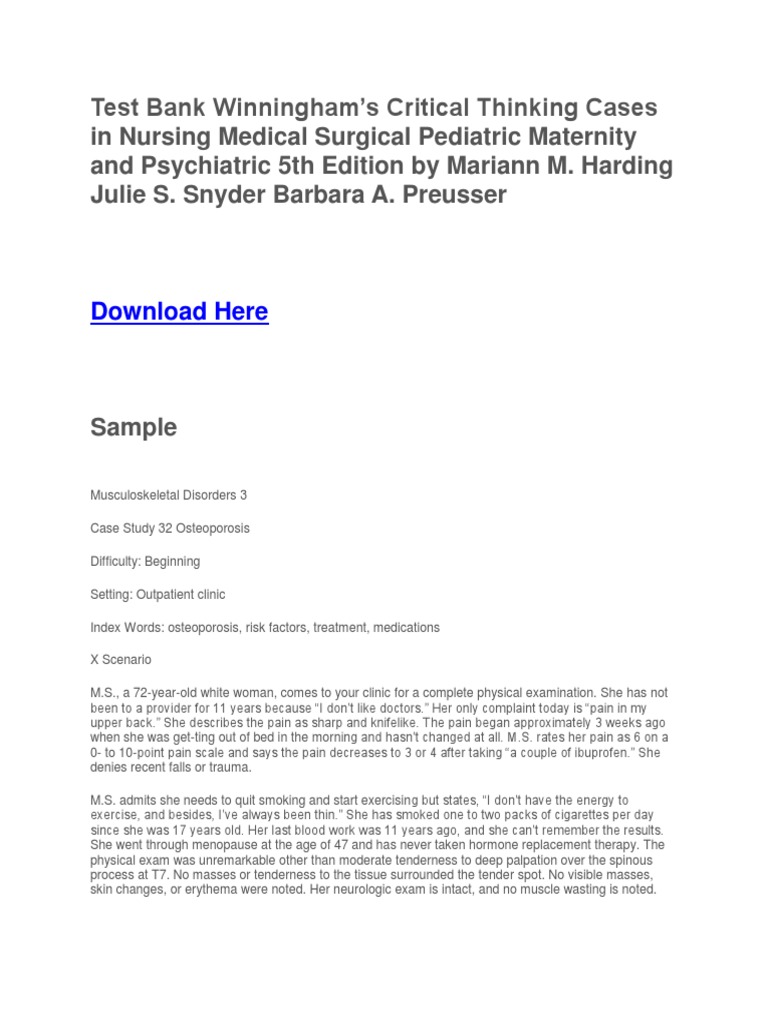 Winningham and preussers critical thinking cases in nursing pdf. Winninghams critical thinking cases in nursing 5th. Case solutions for winningham and preussers critical thinking cases in nursing 4th edition by preusser. Each case in critical thinking cases in nursing 4th edition covers a common problem drawn from actual clinical experiences and written by nurses who are clinical experts. Critical thinking nursing case studies winninghams critical thinking test bank winningham surgical case study 26 winningham case study 145 part one medical surgical cases related searches winninghams critical thinking answer key winninghams critical thinking answers winninghams critical thinking test bank winningham surgical case study 26.